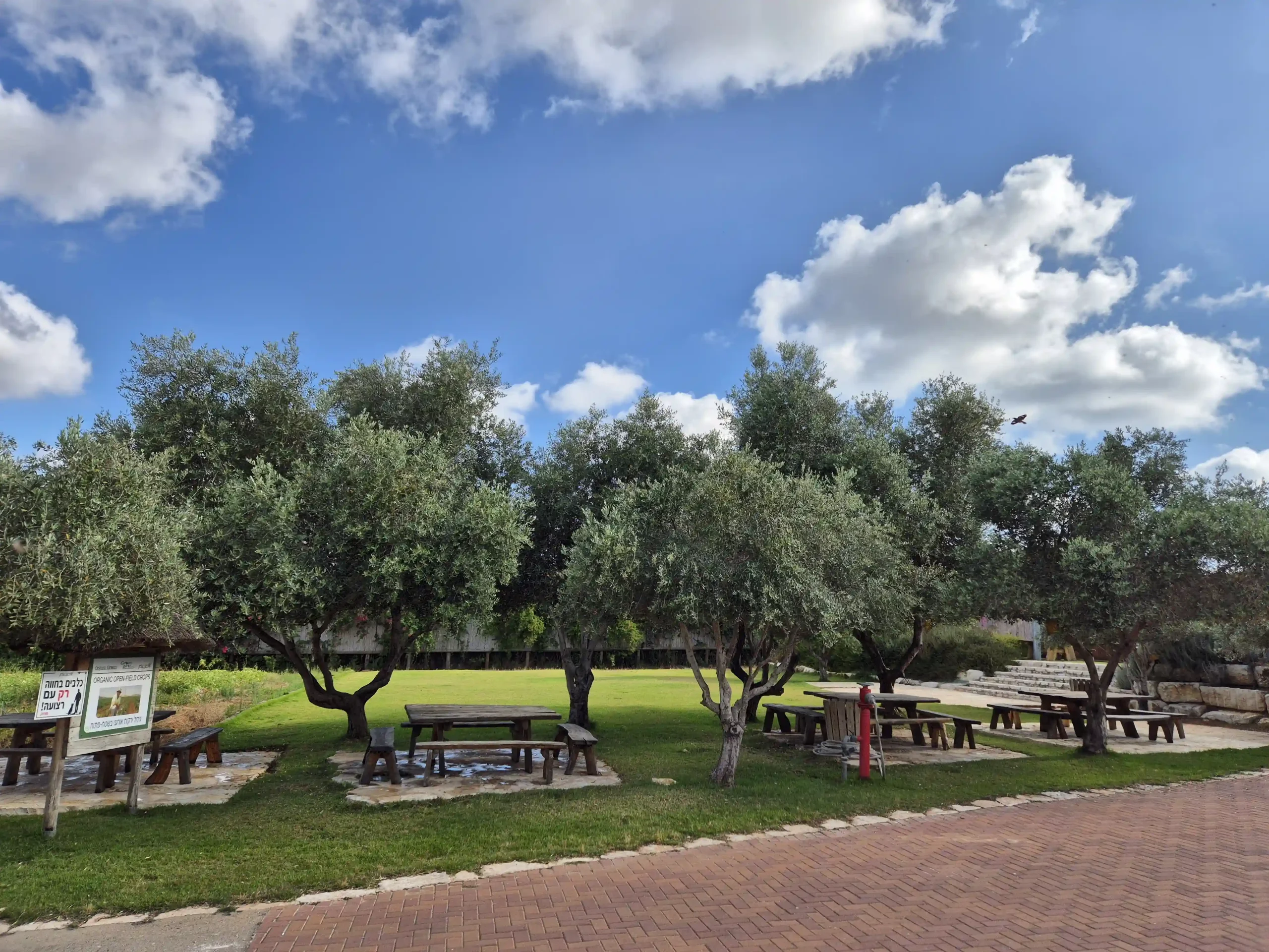 במרחב הפתוח בחווה, כולל רחבות דשא גדולות מוצלות, פינות ישיבה, שולחנות גדולים מוצלים בין עצי זית.