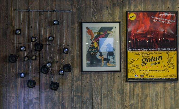 הרצפה והקירות מכוסים בעץ טיבעי, וכרזות של הופעות של אמנים מכל העולם.