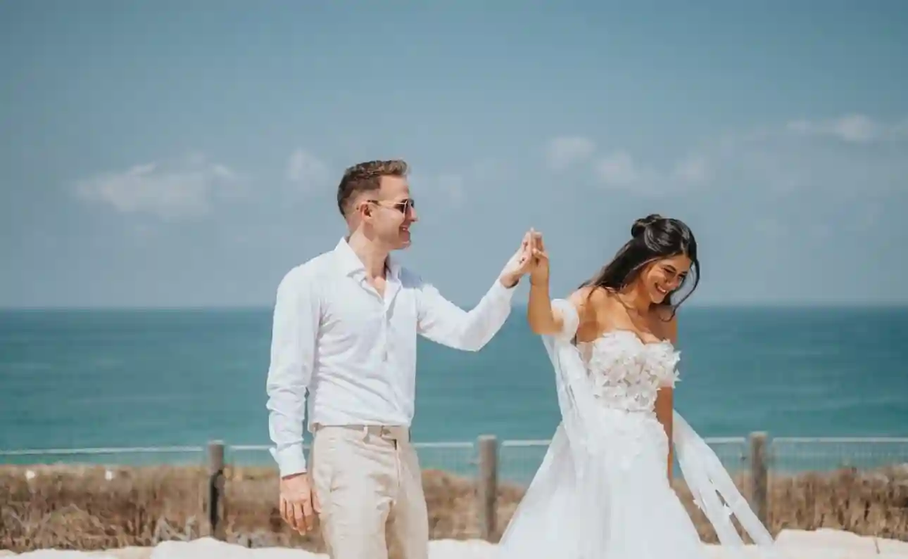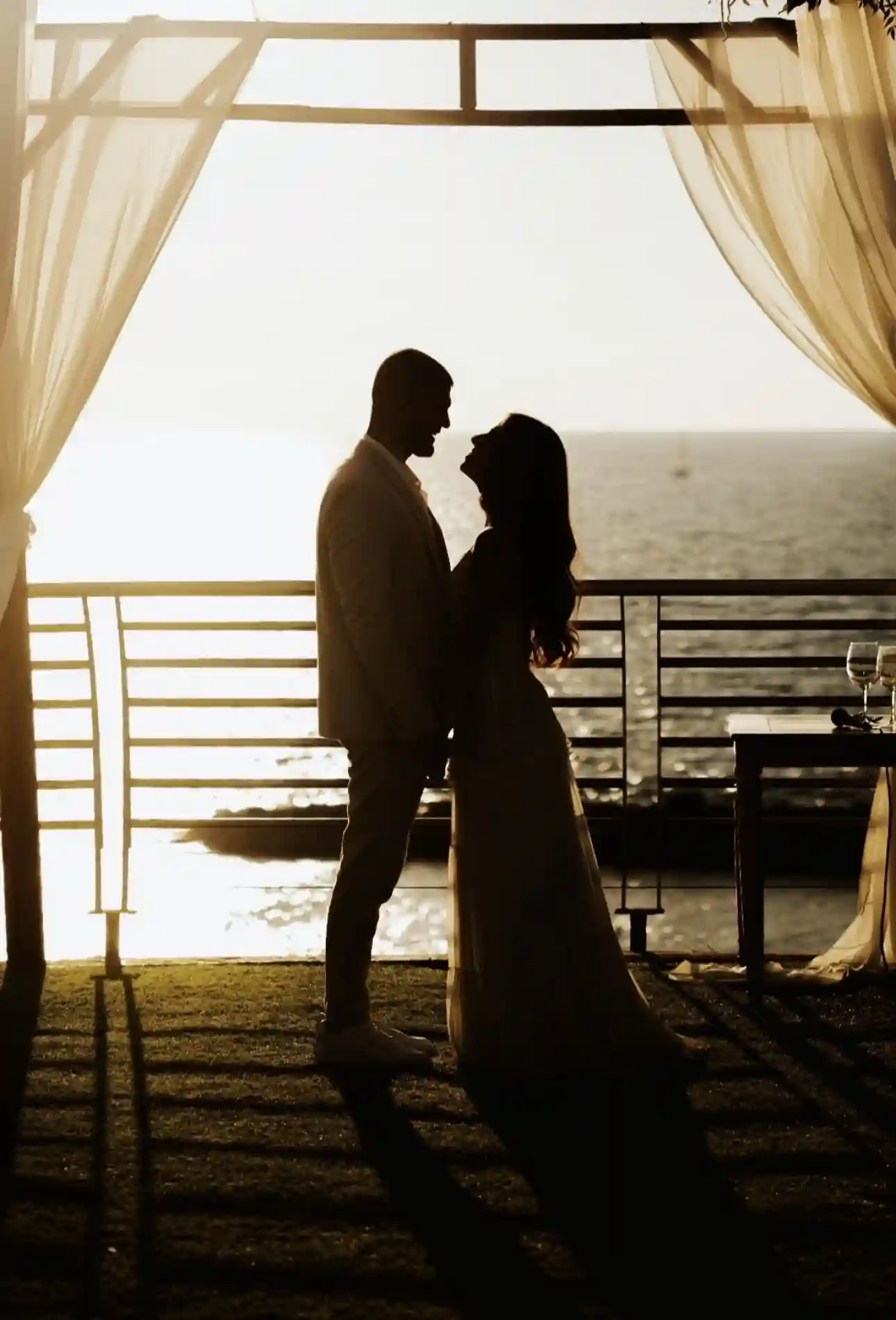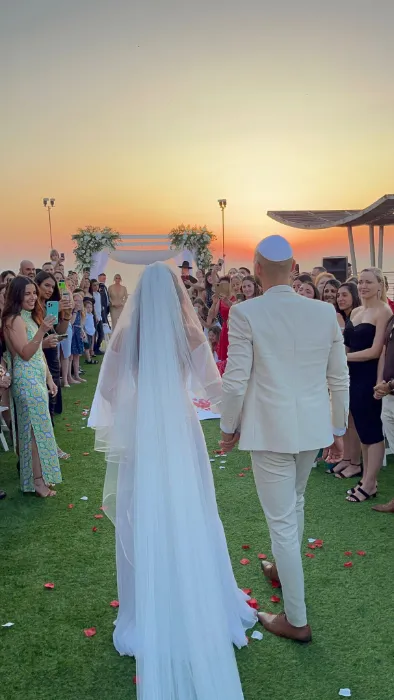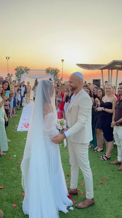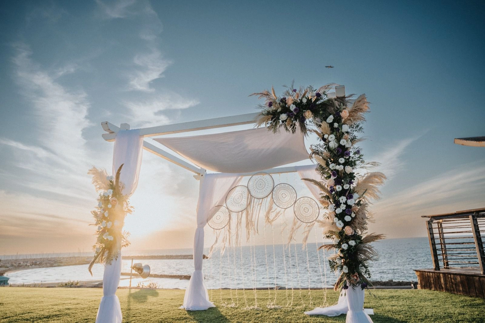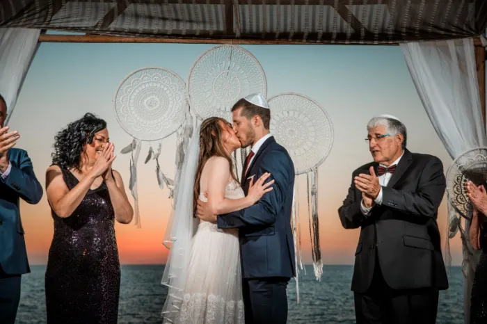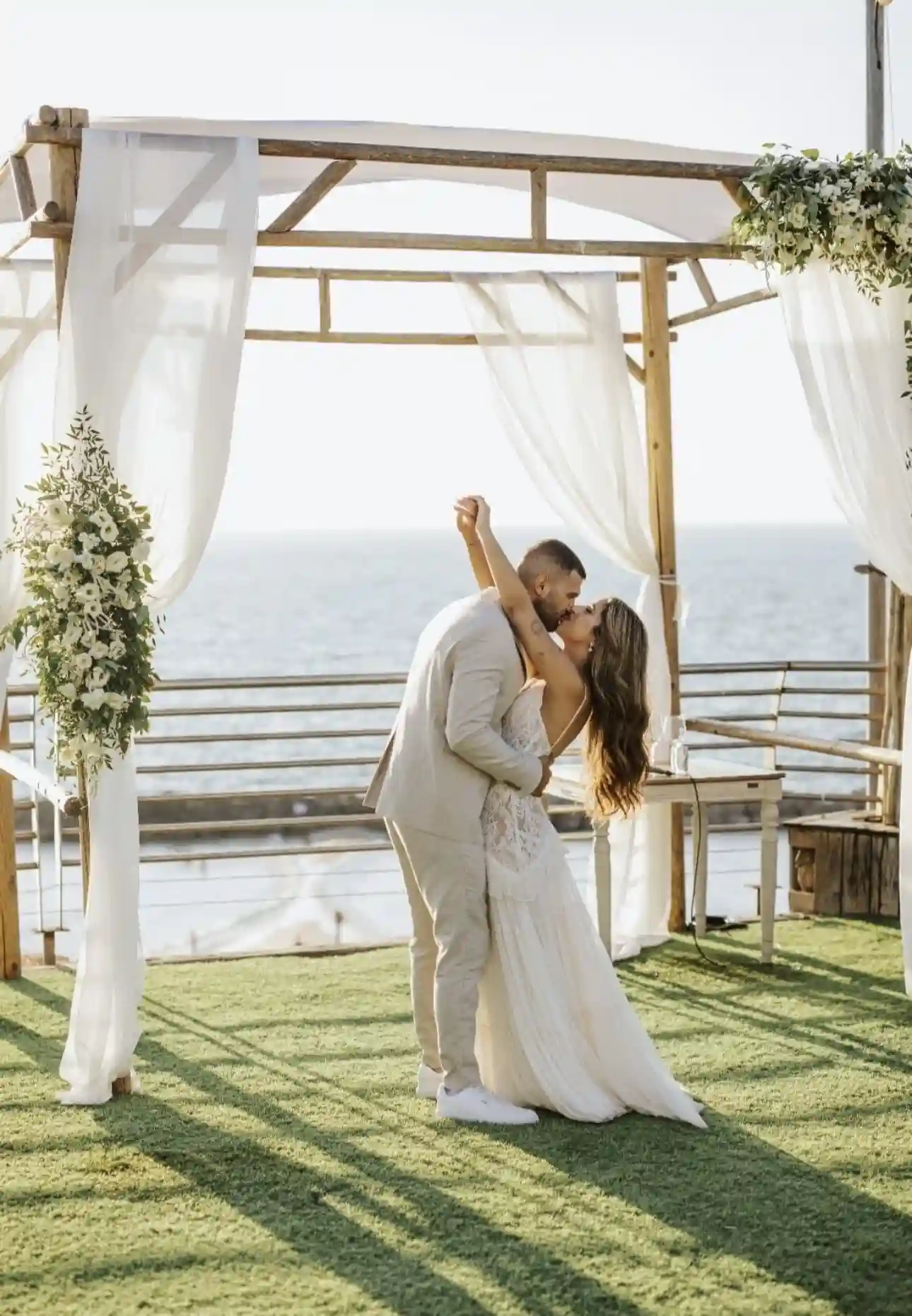 עם חופה מושלמת על הים, מול השקיעה, עם השמש הצהובה, הים הכחול והחול הלבן