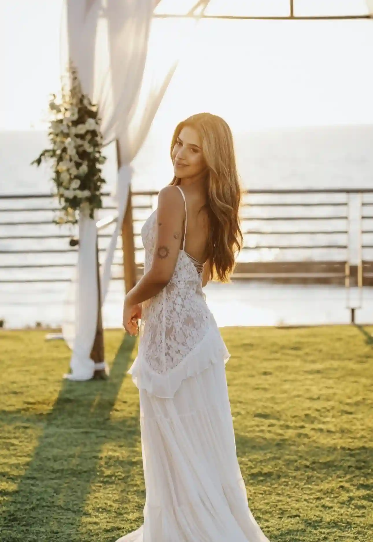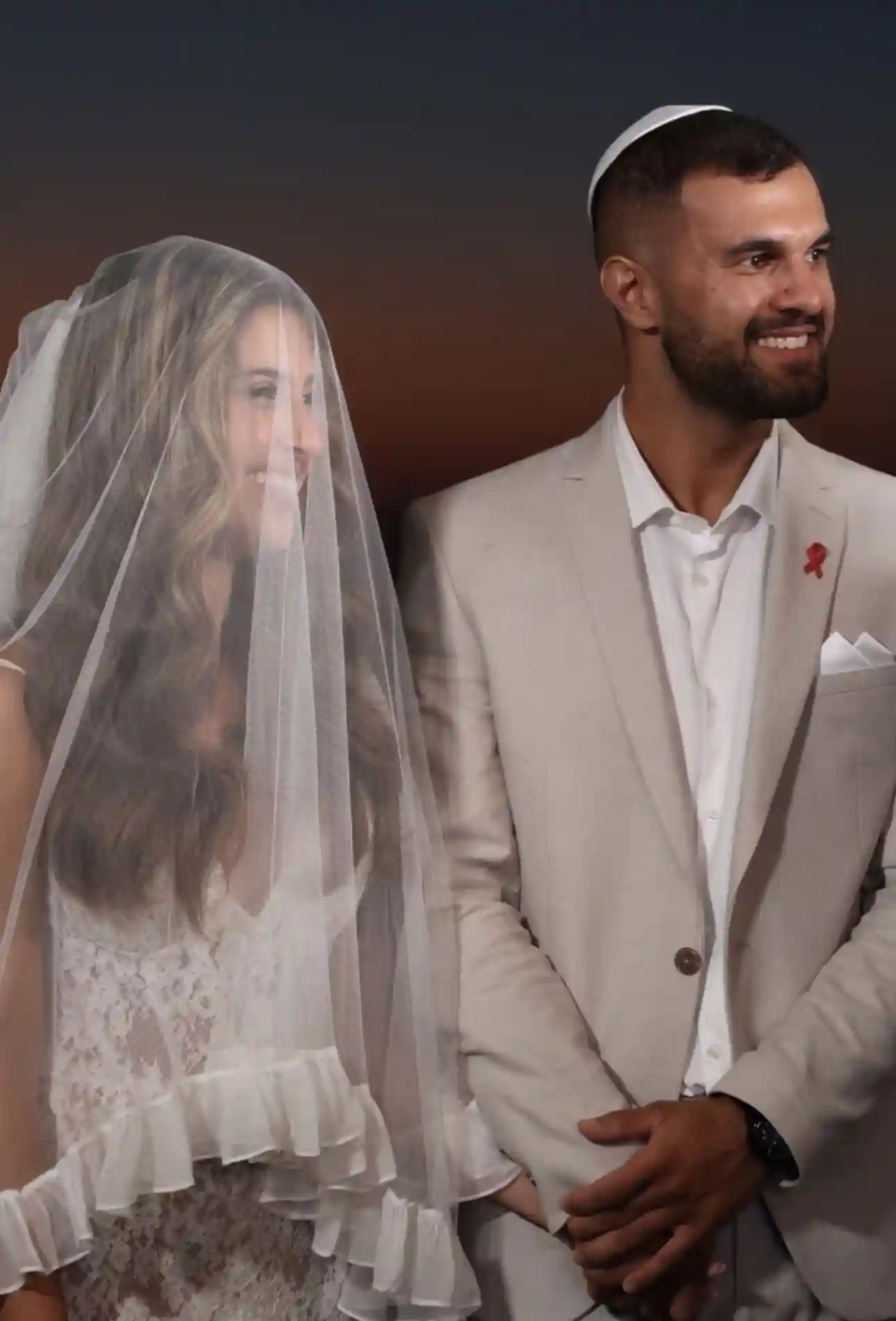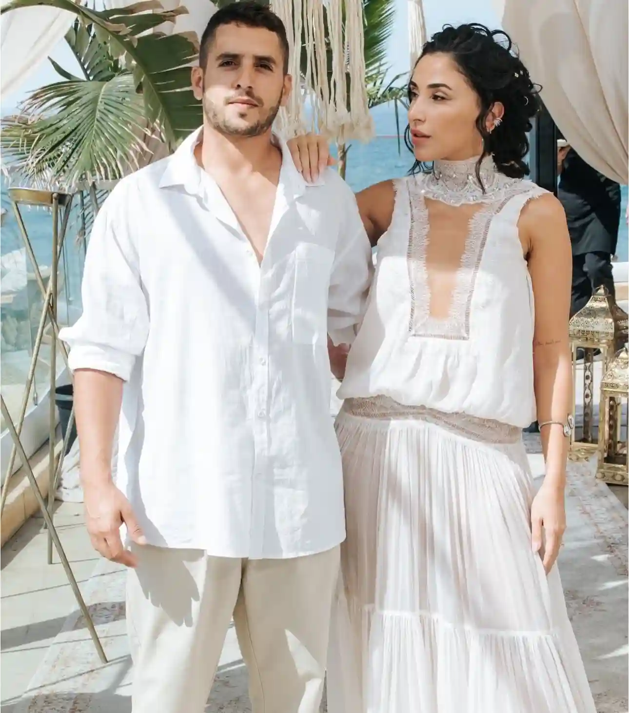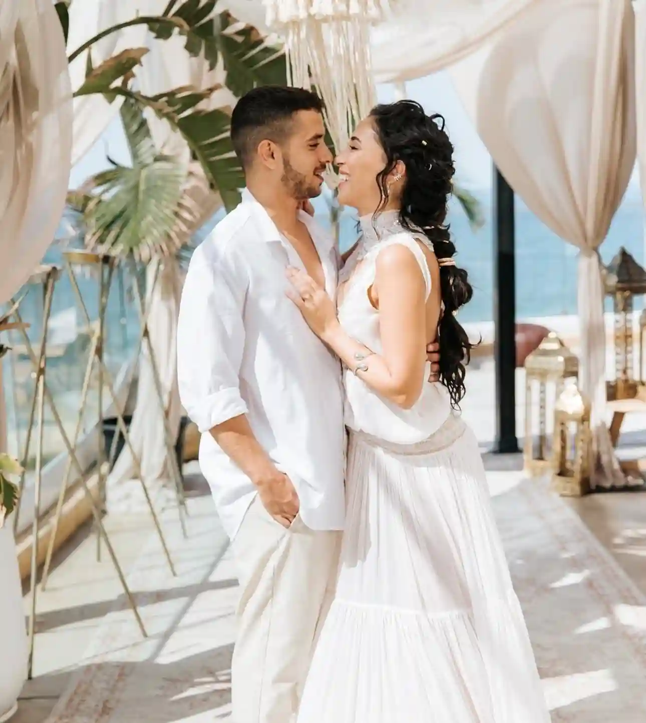 עם חופה מושלמת על הים, מול השקיעה, עם השמש הצהובה, הים הכחול והחול הלבן