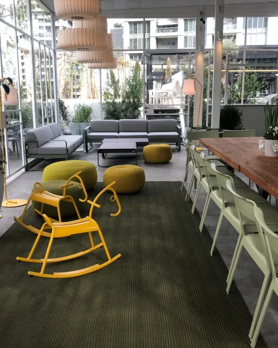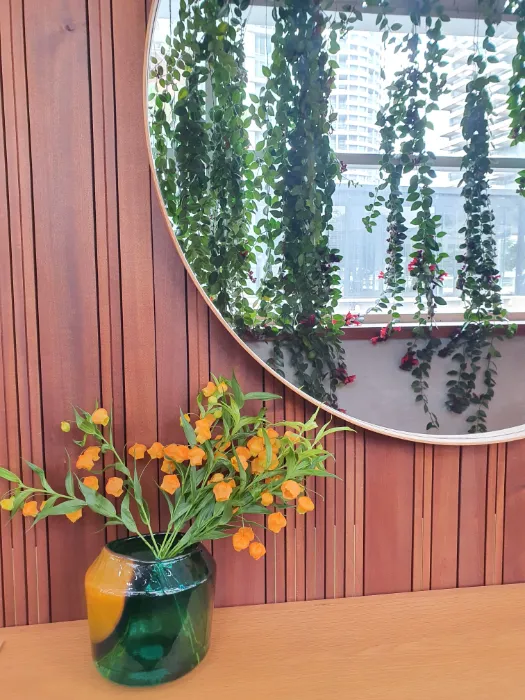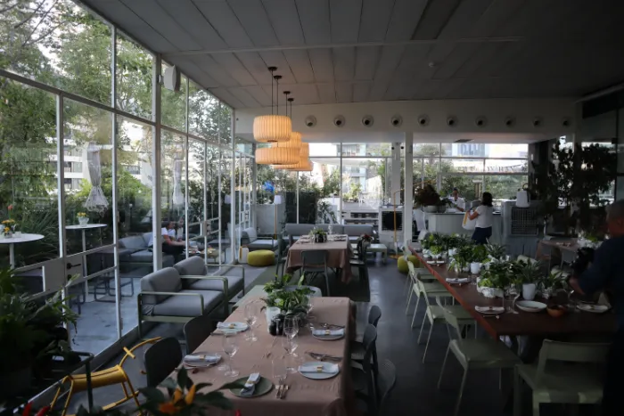 עציצים צומחים בכל עבר, זכוכיות ושקיפות עם אווירה כפרית אורבנית. שילוב של כפריות בתוך עיר.