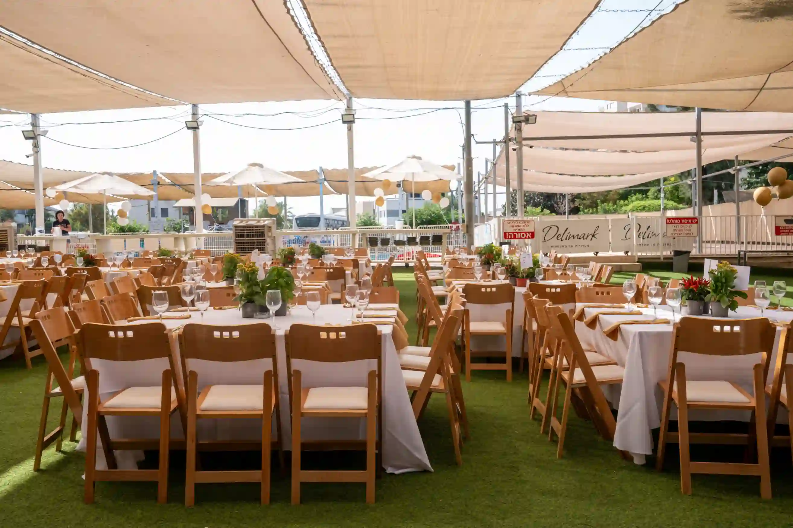 ציוד לוגיסטי מלא הכולל פתרונות ישיבה, הצללה ומערכות הגברה.