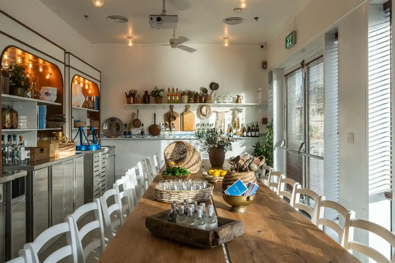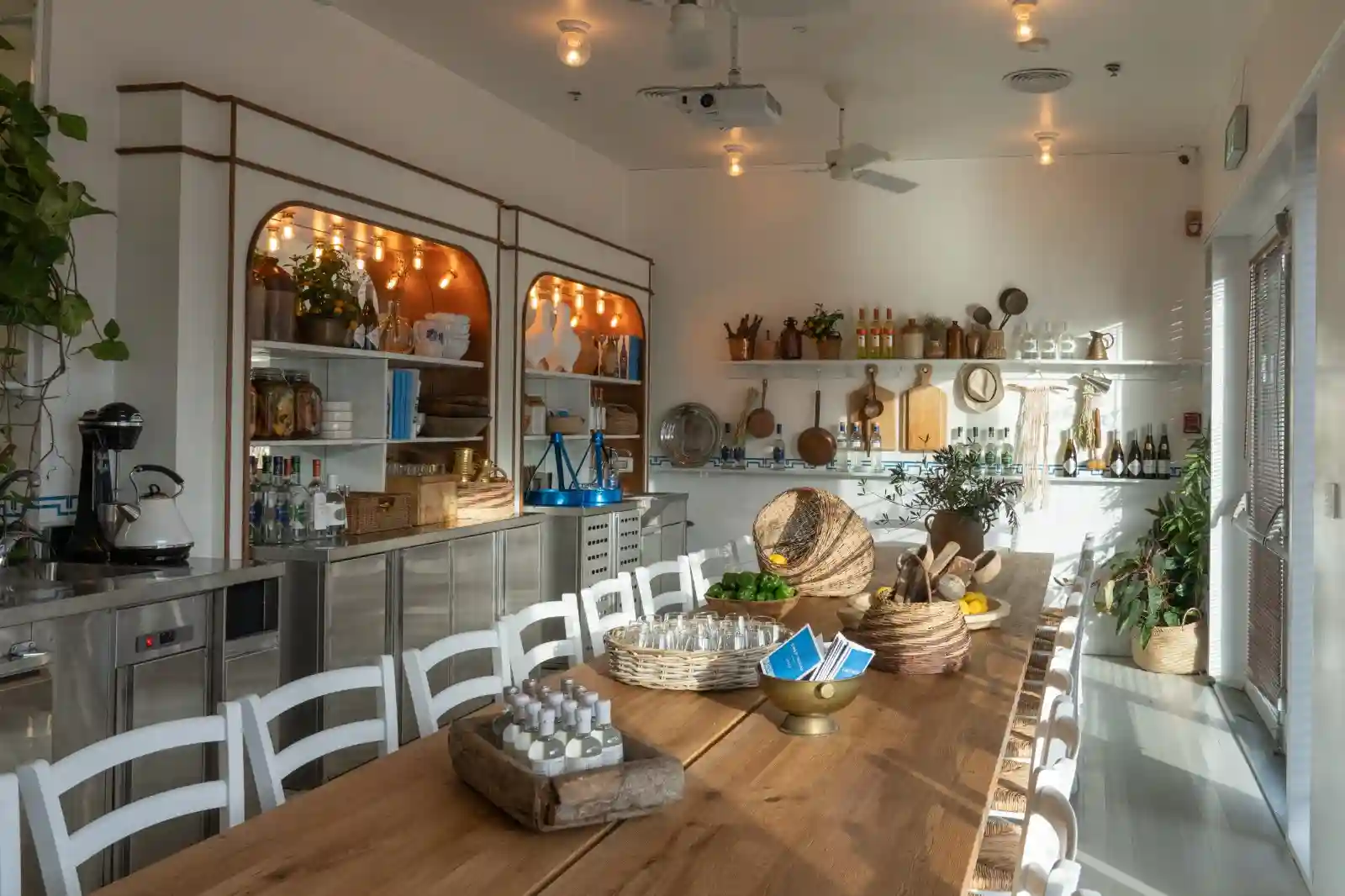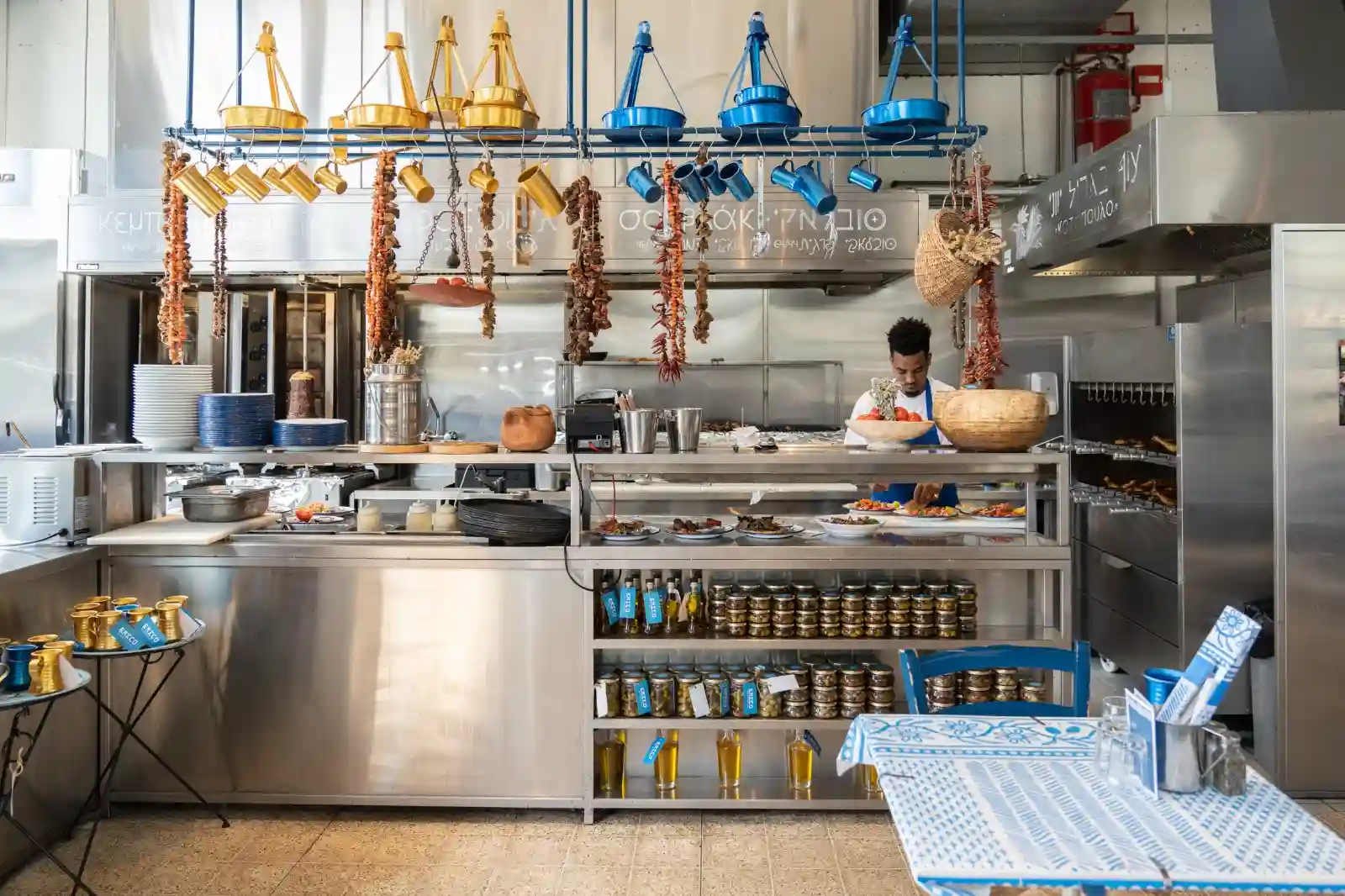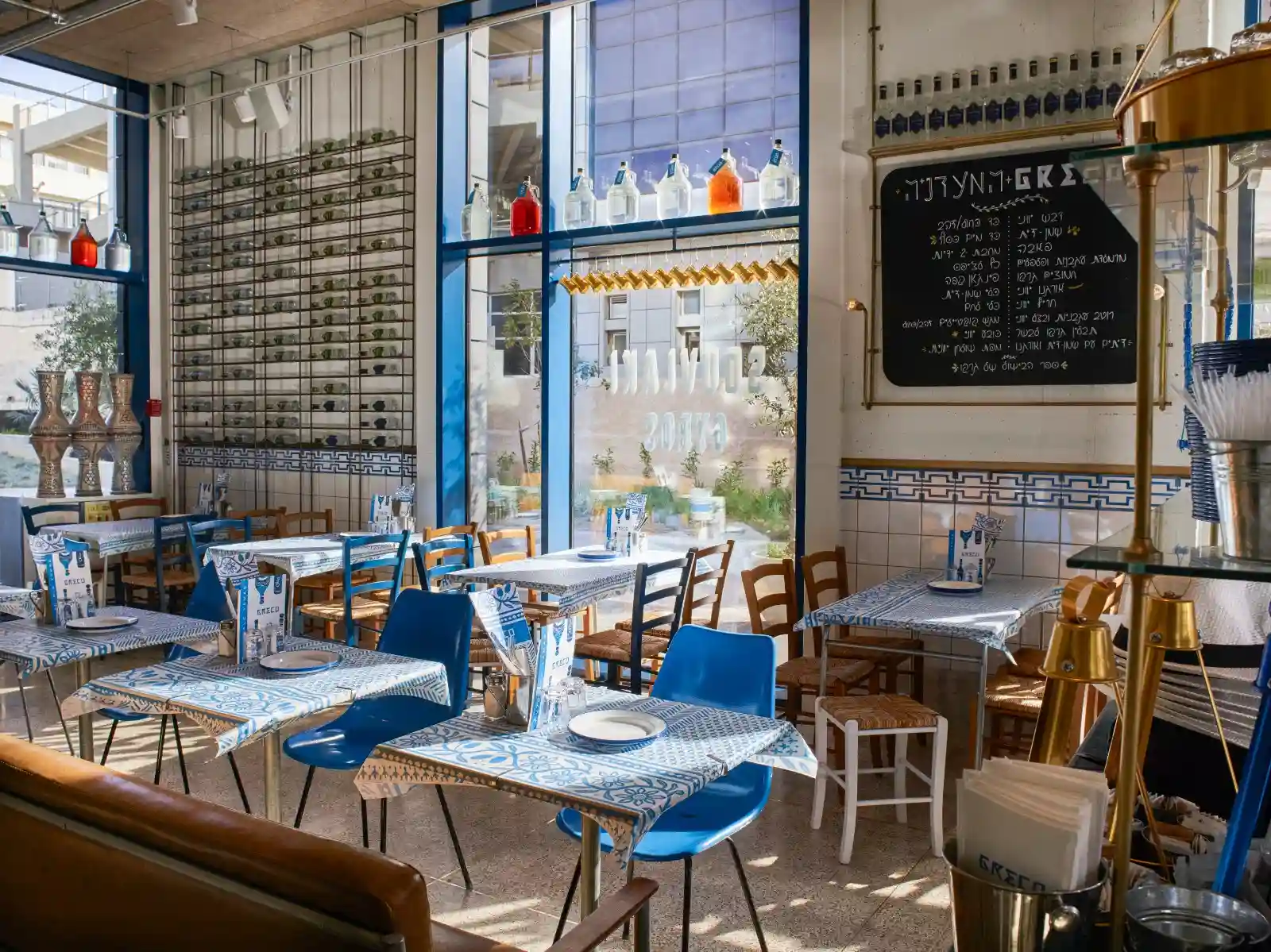 המסעדה מעוצבת באווירה יוונית מסורתית, עם קשתות אבן, כלי חרס צבעוניים ותמונות נוף מרהיבות.