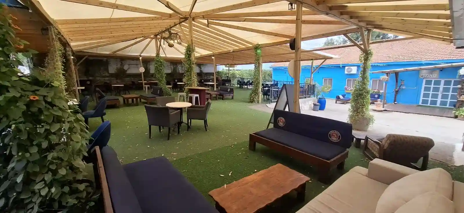 מתחם מקורה עם שפע ספות ושולחנות בו ניתן לארח עד 150 אורחים בישיבה סביב שולחנות או 250 אורחים במסיבות.
