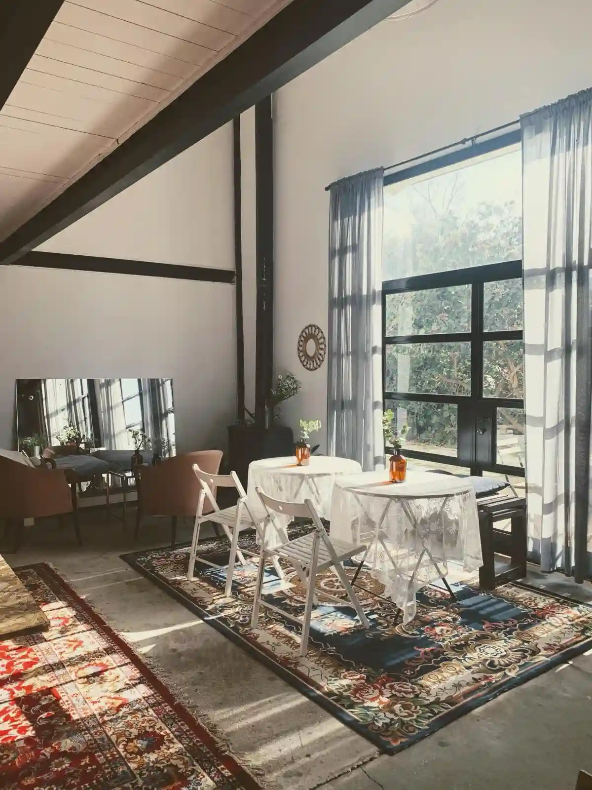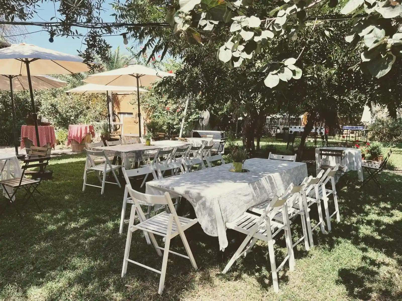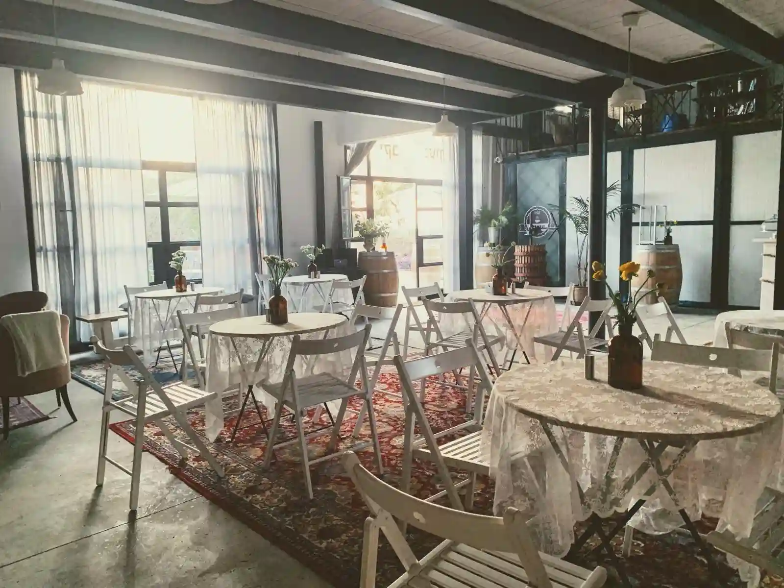 עם אווירה אינטימית מדהימה, שולחנות וכסאות אקלקטיים, צמחיה, חלונות בלגיים