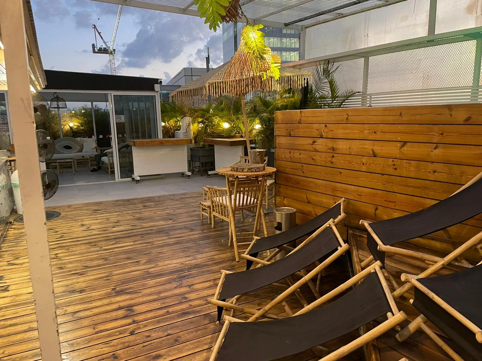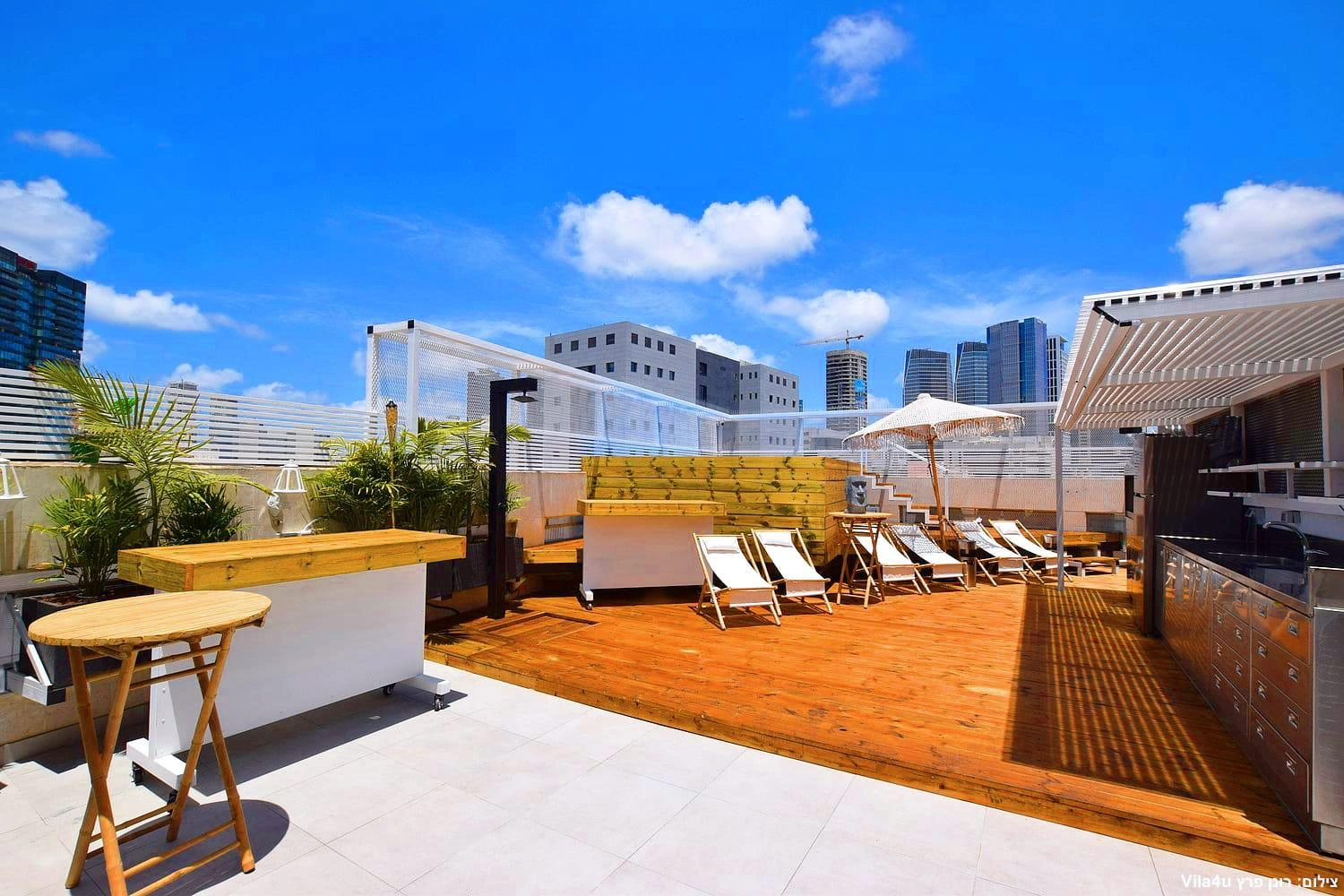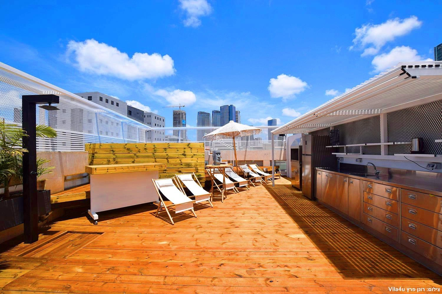 שילוב של אוכל מצוין, מקום מדהים, מערכת הגברה מושלמת, בריכת שחיה, גג לכל תל אביב, דק רחב ידיים, עם מטבח פתוח לאירועים.