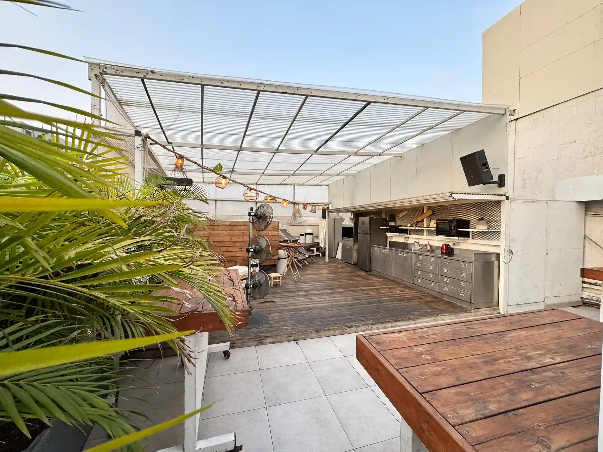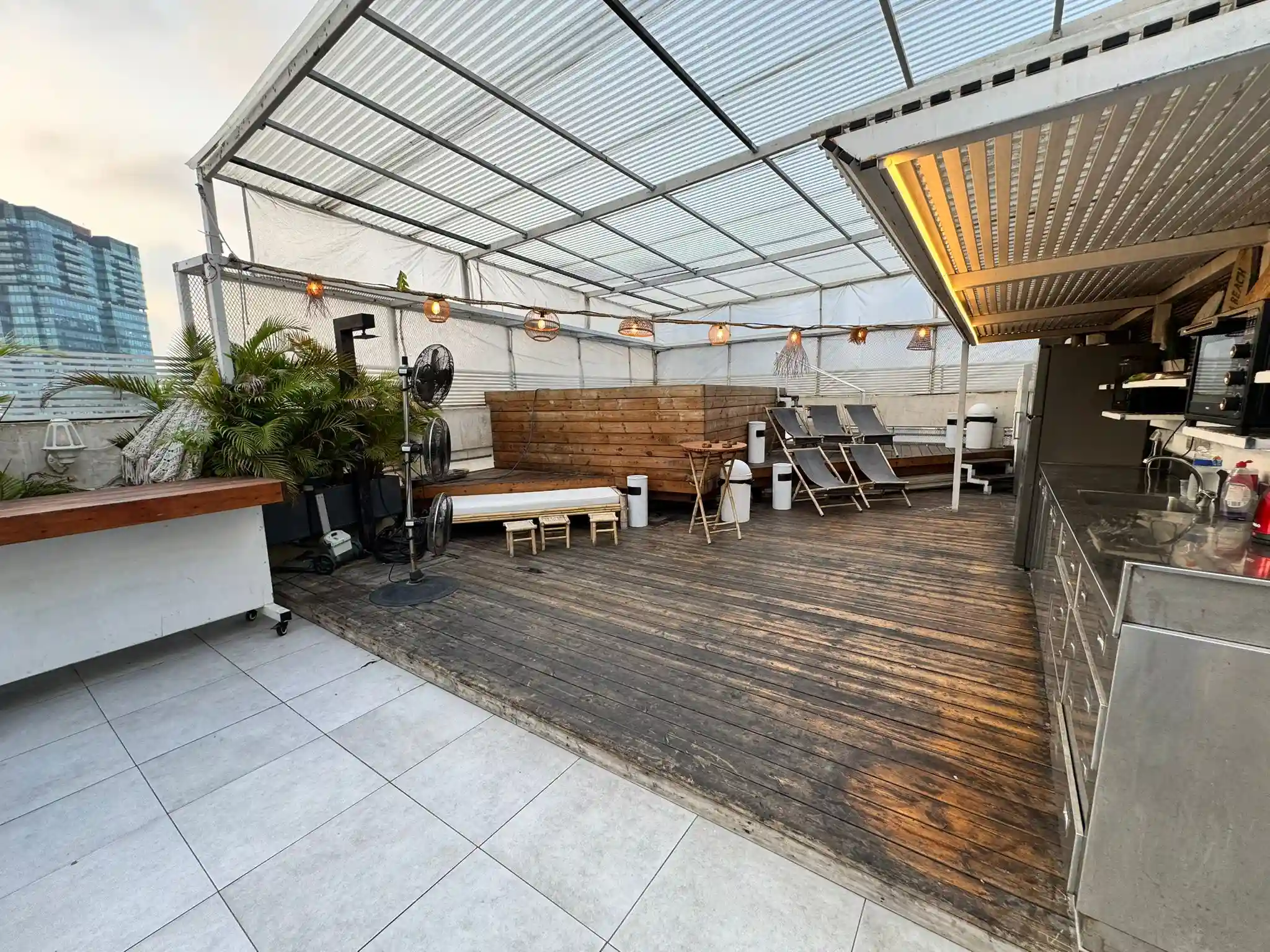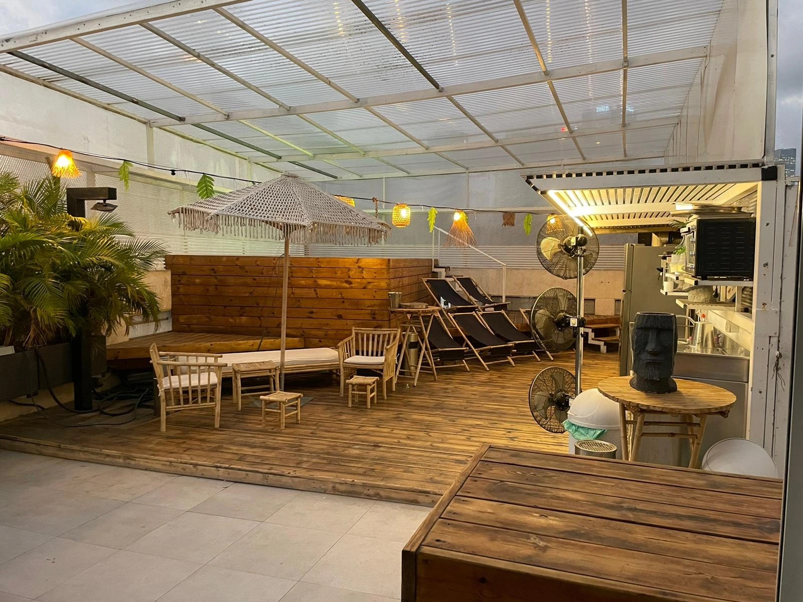 שילוב של אוכל מצוין, מקום מדהים, מערכת הגברה מושלמת, בריכת שחיה, גג לכל תל אביב, דק רחב ידיים, עם מטבח פתוח לאירועים.
