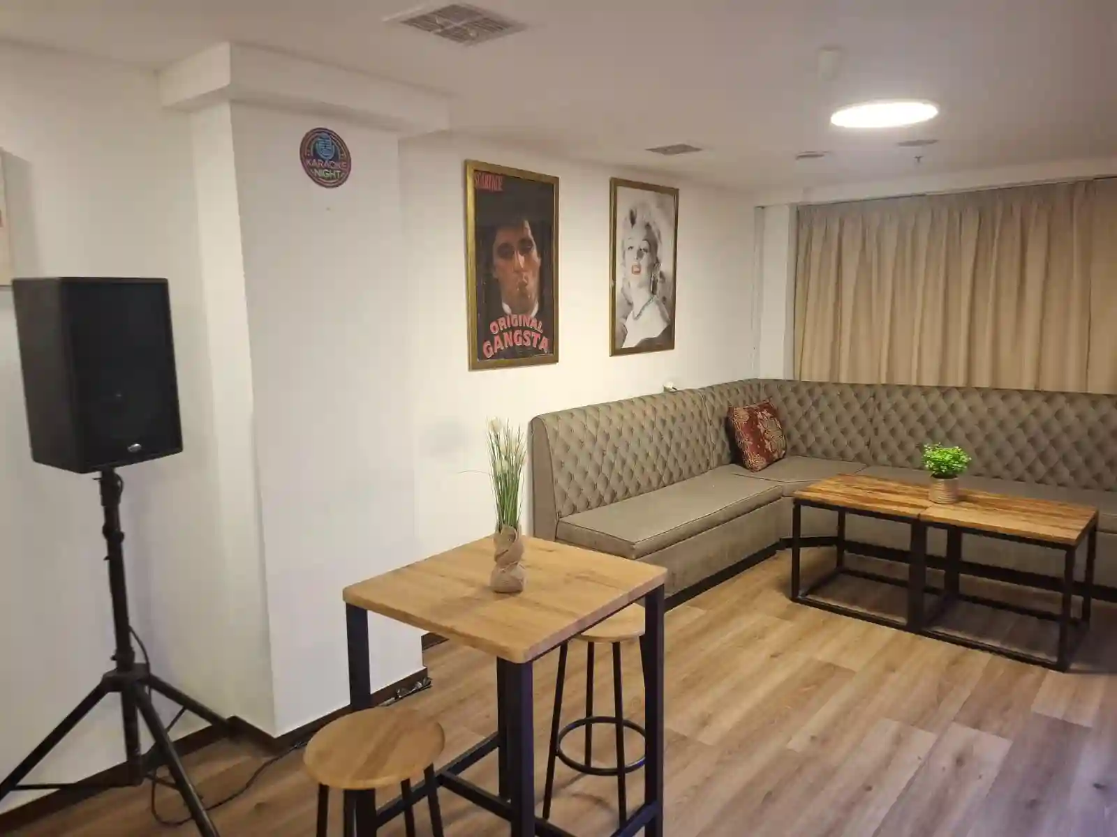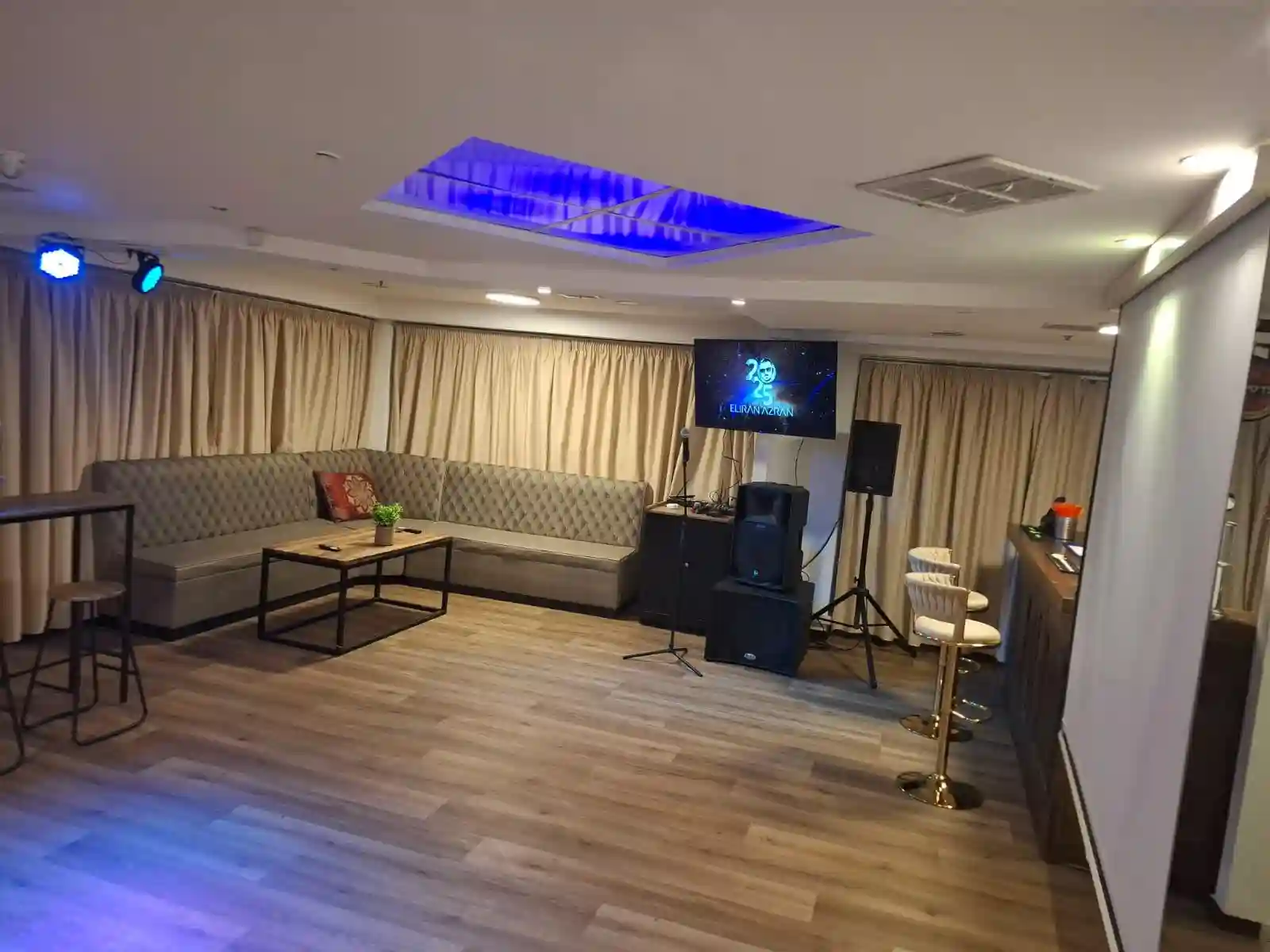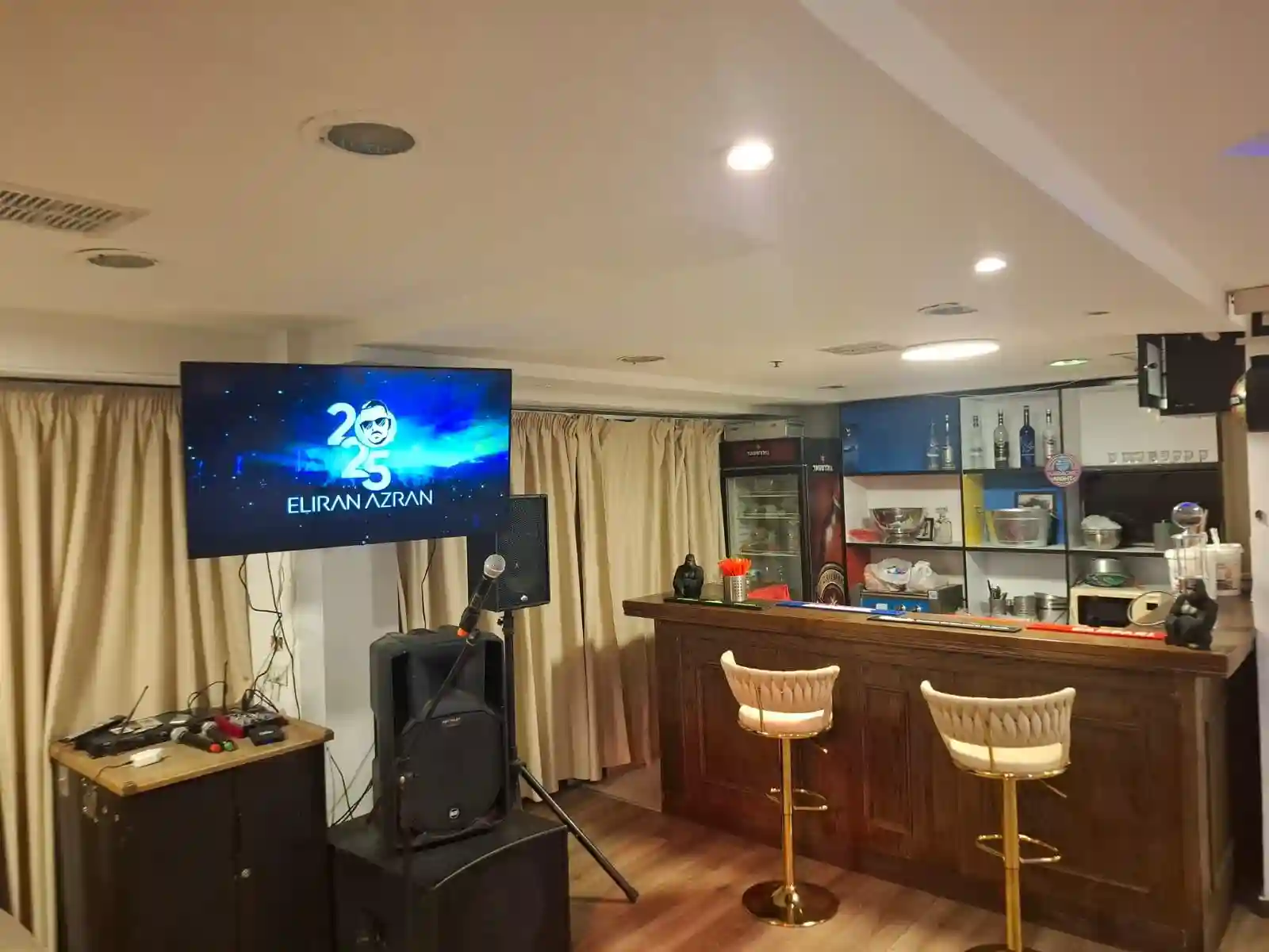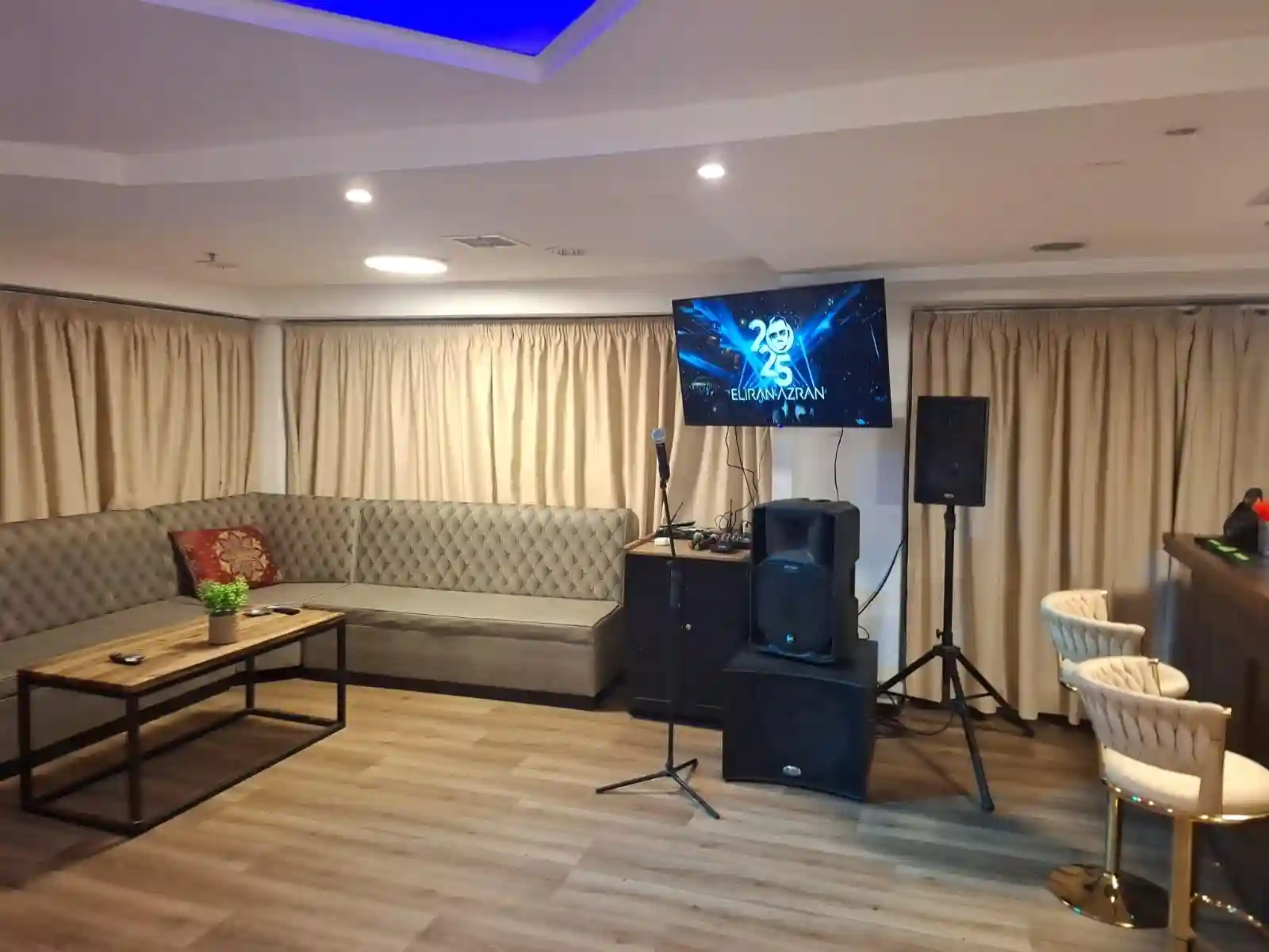 החלל שלנו גדול, מרווח ומעוצב בסטייל, עם ספות נוחות שמזמינות אתכם להירגע ולהרגיש בבית. מערכת הסאונד המתקדמת והמסכים הגדולים מבטיחים חוויית שירה מקצועית, והתאורה הצבעונית מוסיפה לאווירה הקסומה.