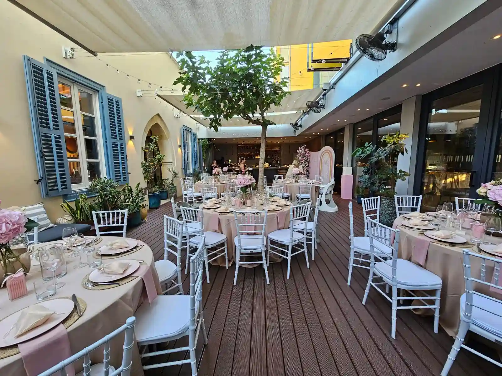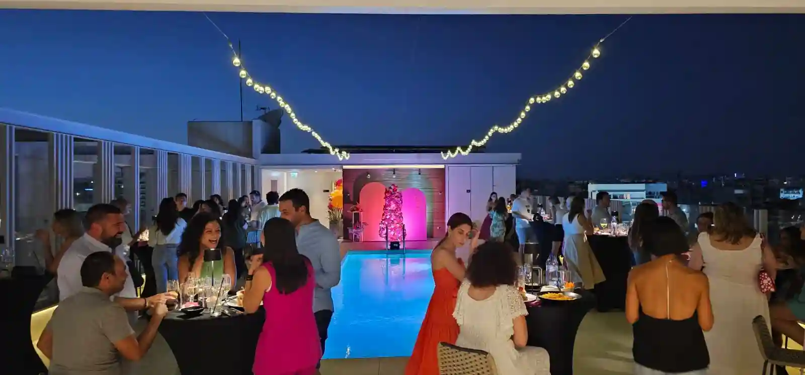 Rooftop Venue: לוקיישן הגג כולל בריכה ובר עם נוף פנורמי לים התיכון, והוא המקום האידיאלי לקיום טקסי חופה, קבלות פנים אלגנטיות ואירועי קוקטייל פרטיים בשקיעה.