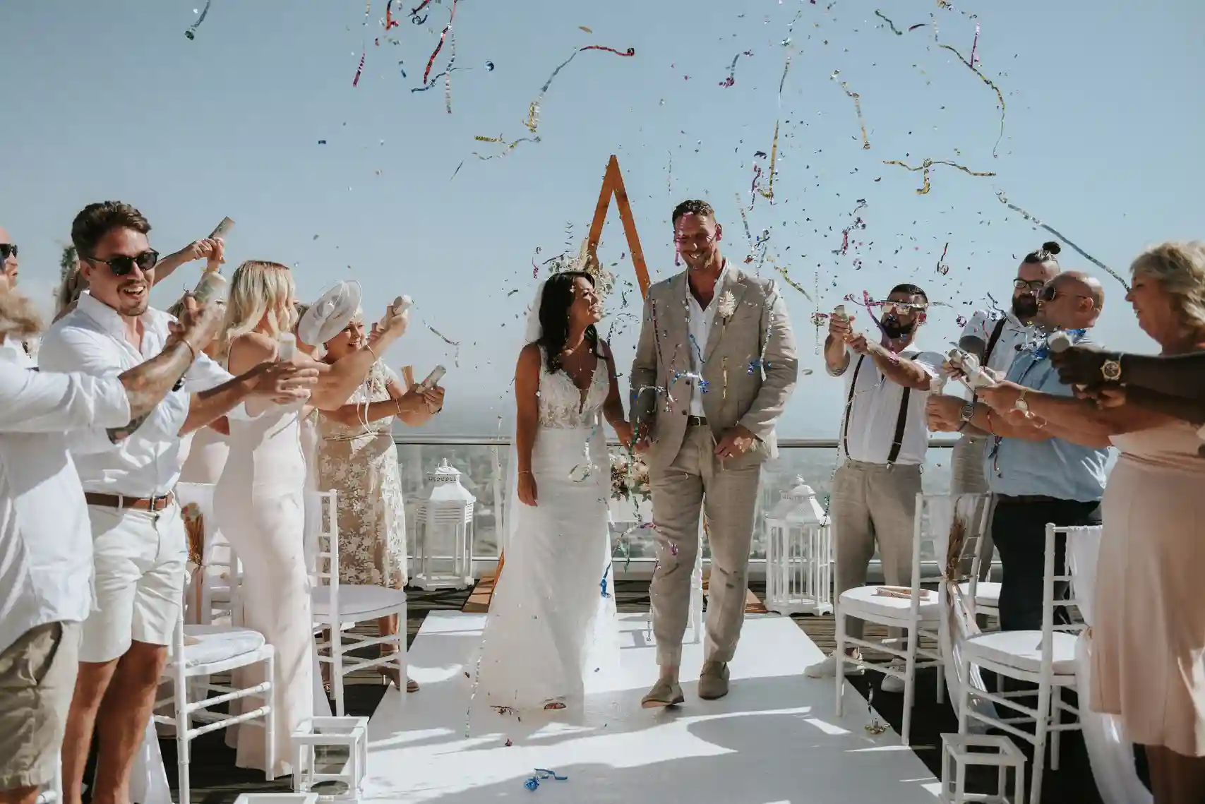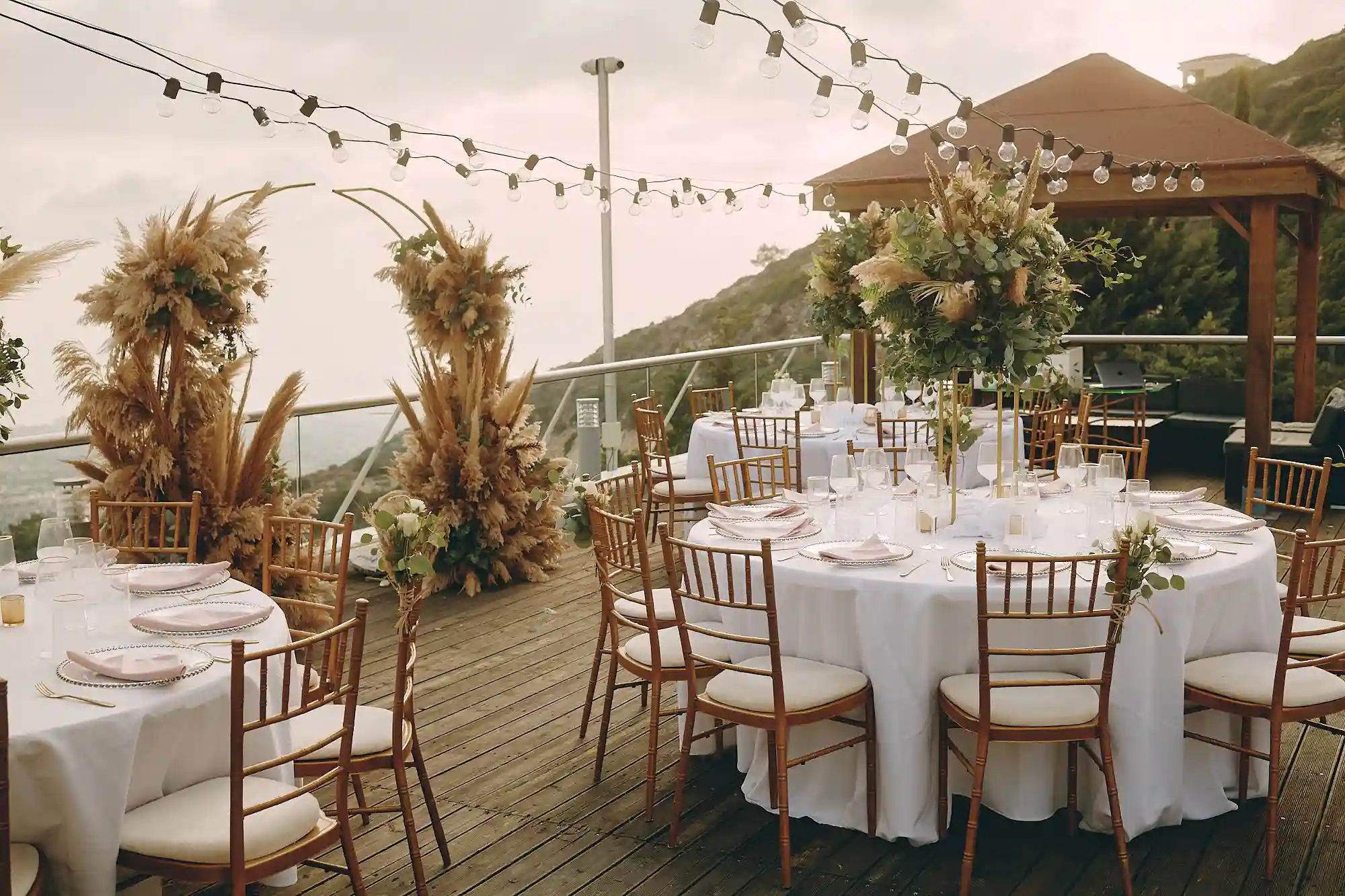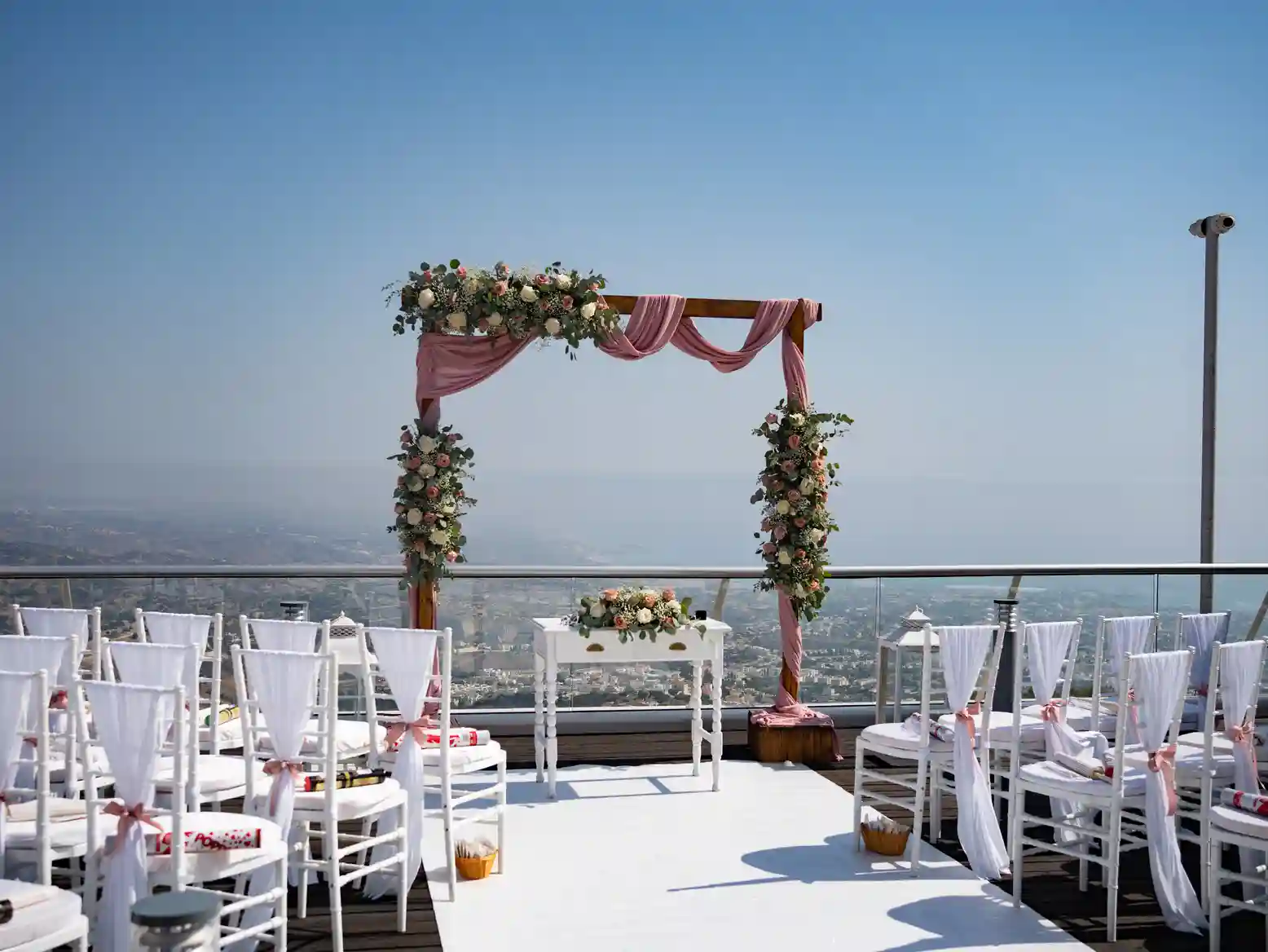מרפסת הגג המרווחת: סיפון עץ עליון המיועד במיוחד לקיום טקסי חופה וקבלות פנים, עם נוף אינסופי לים התיכון בזמן השקיעה.