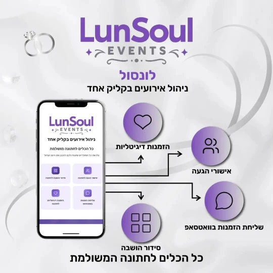 לונסול היא פלטפורמה דיגיטלית מתקדמת שמרכזת את כל ניהול האירוע במקום אחד, בקלות, במהירות ובסטייל.